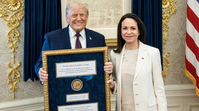 ඉකුත් දා වෙනිසියුලාවේ ජනාධිපති නිකොලස් මදුරෝ පැහැරගෙන අමෙරිකාවට රැගෙන යාමෙන් පසුව එම වීර ක්රියාව වෙනුවෙන් තමාගේ නොබෙල් සාම ත්යාගය ට්රම්ප් වෙත ලබා දිය යුතු යැයි ඇය නොබෙල් කමිටුව වෙත යෝජනා කළ ද කමිටුව එම යෝජනාව ප්රතික්ෂේප කර තිබුණා.